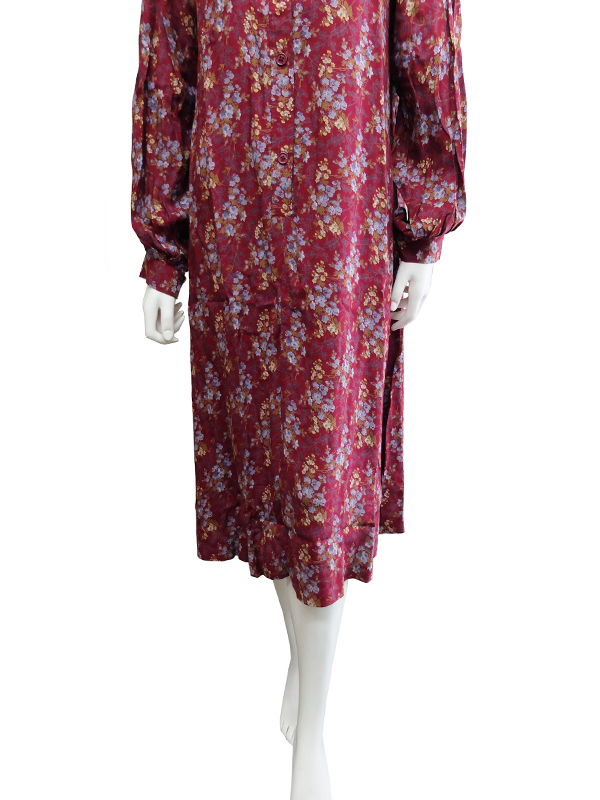 ボリュームスリーブのフラワープリントドレスは、当時を代表するスタイルの1つ。ともすると、ガーリーな印象になりがちな為、敢えて触手を伸ばさずにいる方も多いのですが、ボルドーカラーをベースとしたシックなテキスタイルからは、ありがちなフェミニンさは感じられず、大人の女性にこそお薦めしたい1着。