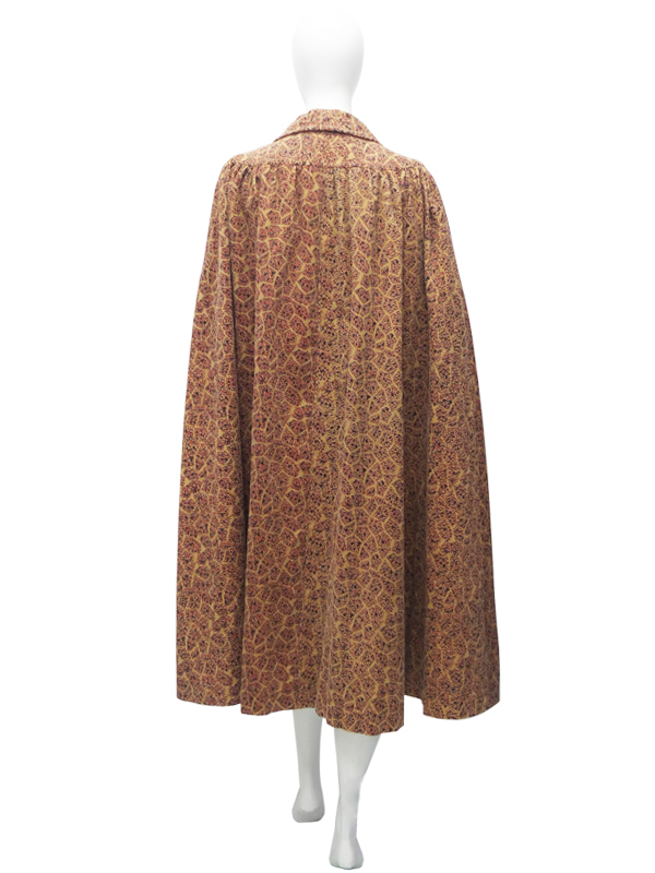 約0.2mmの細畝のコーデュロイ生地に、葉脈の様に不規則に伸びるブラウンベージュの網目の中にはブラックやオレンジのドット状のプリントが施されており、肌触りだけではなく、視覚的にも凹凸感の豊かな興味深いテキスタイル。