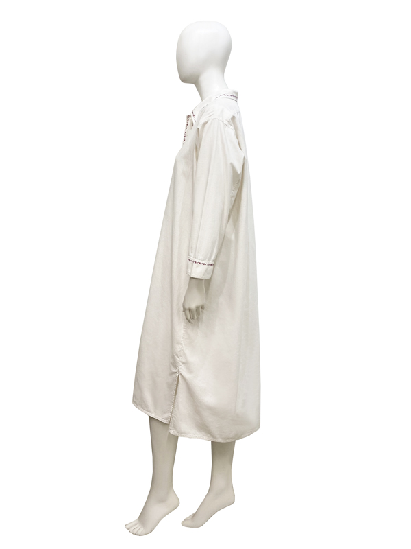 コットンのライトな肌触りのシャツドレスは、白地のボディに襟やカフスに施されたデザインや八分袖のスリーブデザインがカジュアル過ぎない印象を生み、視覚的奥行きに富んだ一点。