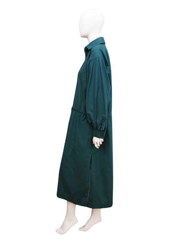 ボタンを含めワントーンで仕立てられたシャツドレスは、深みのあるブルーグリーンの色彩が放つアンニュイなムードが目を惹く、サファリ・ルックの文脈から派生した作品。