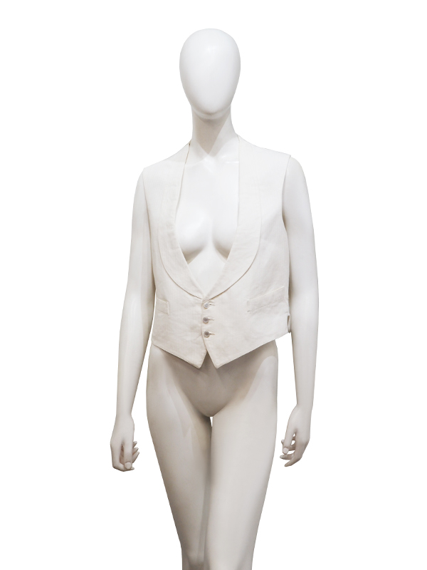 カーヴィーなショールカラーデザインが見せる端正な表情が特徴的なジレは、ドレスシャツやワンピース、ハイウエストボトムとのスタイリングも良く、現代のワードローブに寄り添うモダンなバランスが魅力の一つ。
