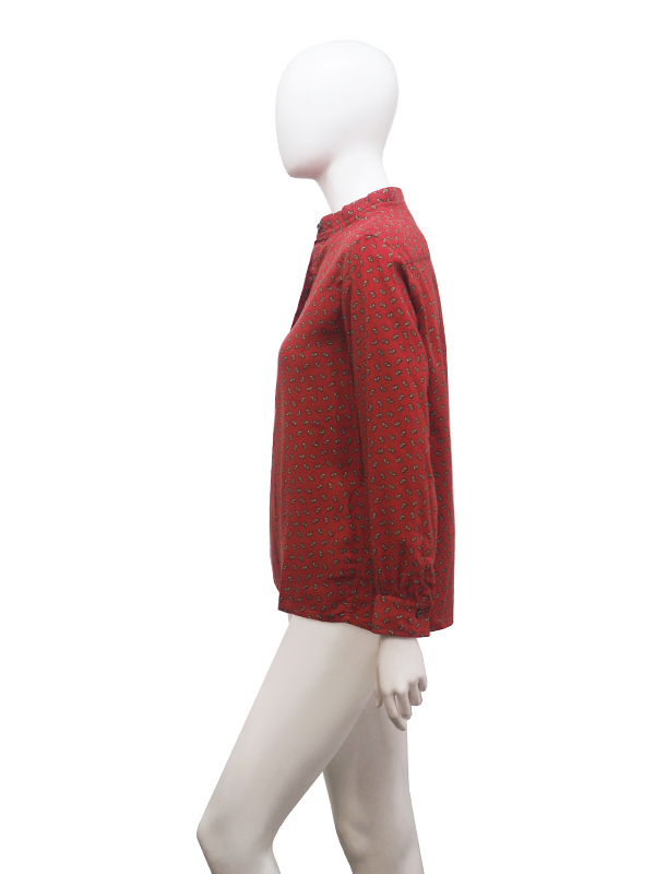 スタンドネックカラーのボディーにペイズリーパターンが描かれたシャツは、鮮やかすぎないレッドカラーも相まったヘルシーなムードが魅力。
