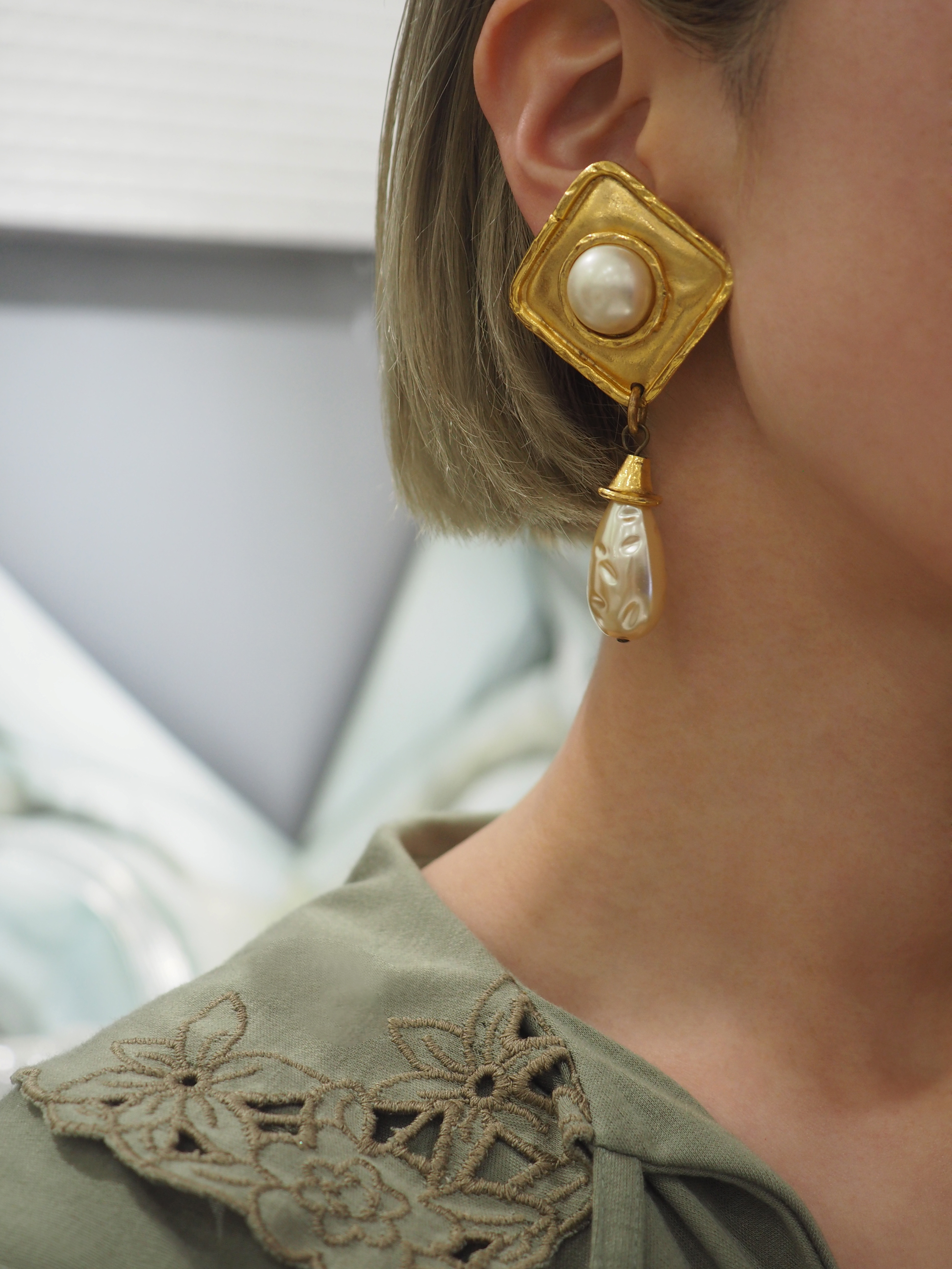 スクエアモチーフとドロップ型のパールが連なったヴィンテージならではのムードを含んだイヤリングは、身体の動きと共に軽やかにスウィングする造形。