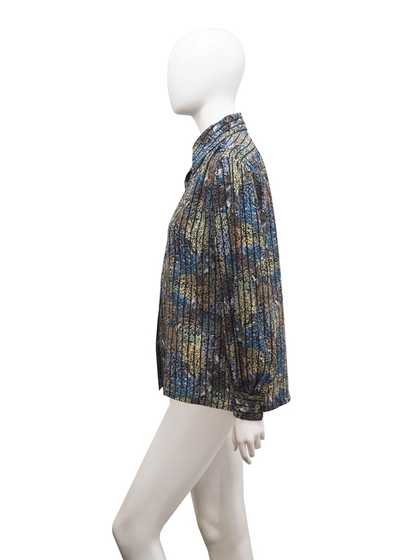 等間隔に伸びるネイビーカラーのストライプ柄の背景に繊細な切り絵の様に数種類の植物が描かれたシルクブラウスは、ライトグリーンやベージュなどのペールカラーが重なり合い、落ち着いた女性らしさが一層引き立つ一着。袖を通すだけで、穏やかな気持ちにさせてくれる作品。
