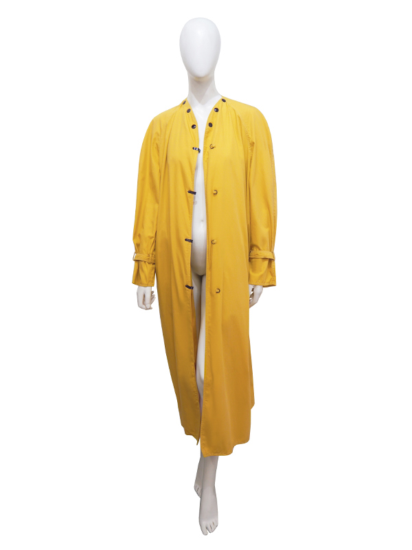 コットン地の穏やかなイエローカラーのロングコートは、フロントに配されたブラックカラーのフックボタンとのコントラストが効いた視覚的センスとユニセックスなデザインバランスに、現代的且つ洗練されたムードが漂う一着。