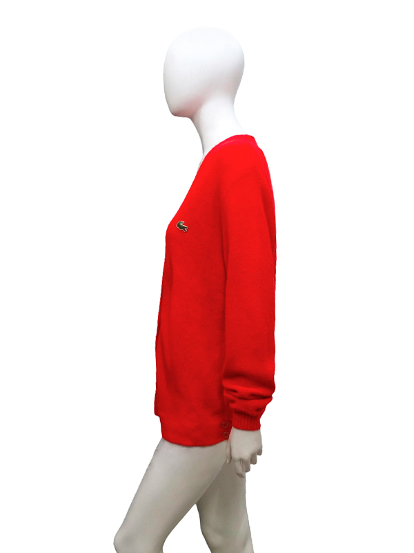 代名詞でもあるワニのマークが左胸に配されたカーディガンは、鮮やかな赤色のプレイフルな色彩が着用者のみならず、見る者にもポジティブなマインドを運んでくれる一着。