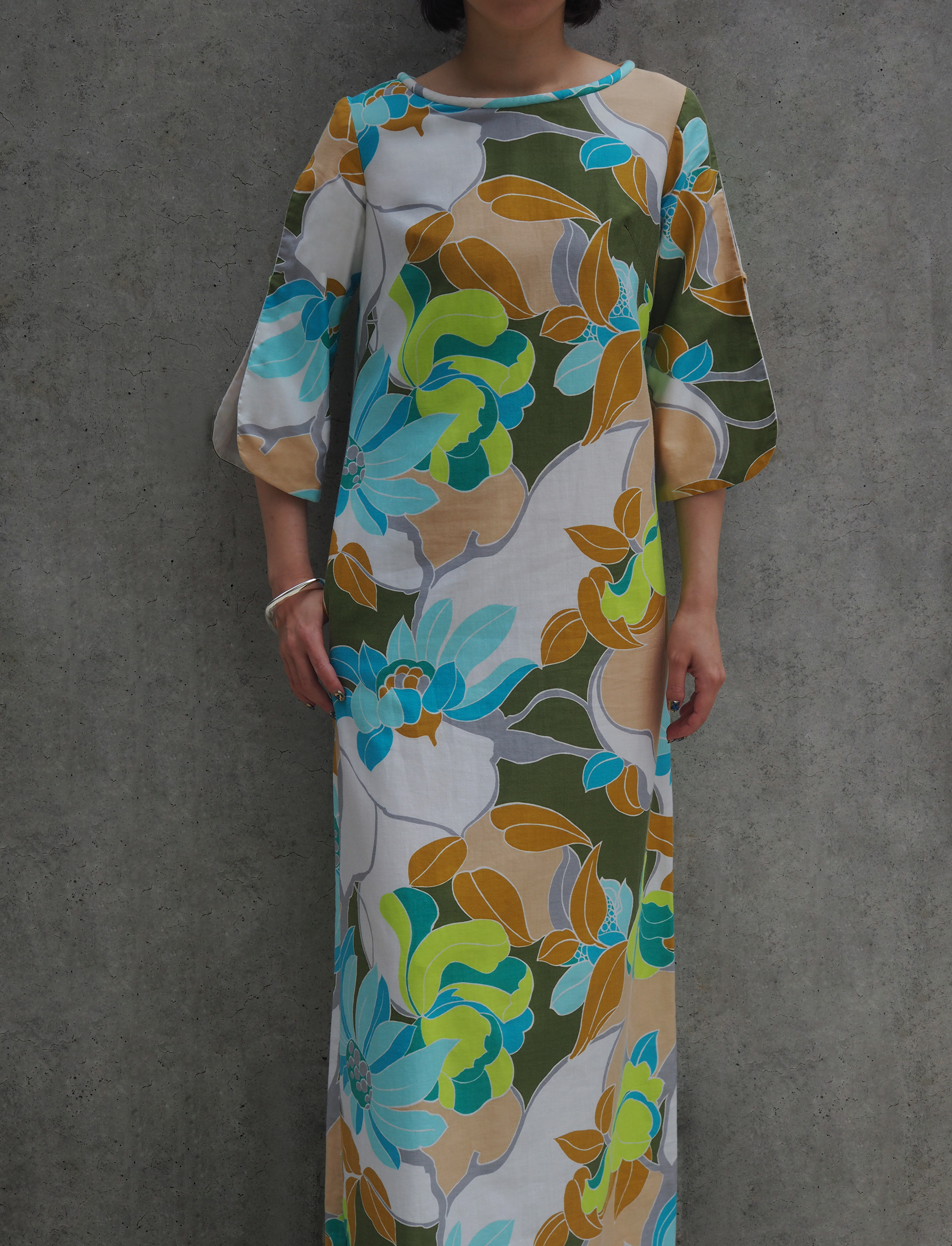 ボタニカルモチーフが描かれたマキシドレスは、柔らかなカラーパレットが織りなす色彩表現にニュアンス豊かなテキスタイルが組み合わさった、モダンな空気を纏った一着。