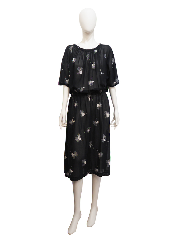 ブラック×ホワイトのモノトーンカラーがヴィンテージシックなシアードレスは、センシュアルなマテリアルに、細やかなギャザーが空気を孕んだ柔らかなシルエットが特徴。