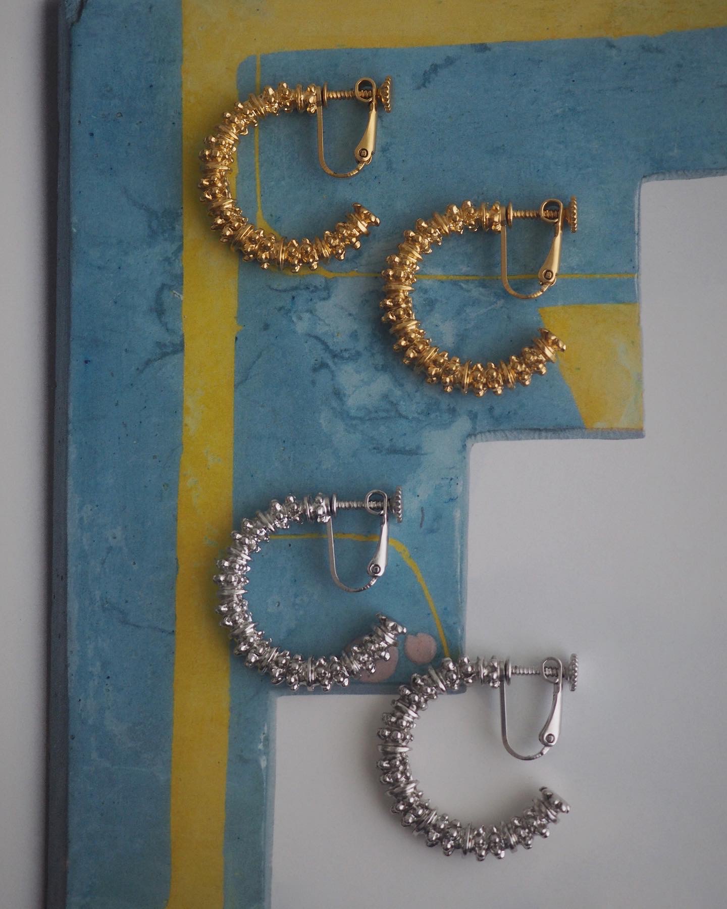 凹凸感のある細やかなデザインが施されたイヤリングは、角度によって異なる表情を見せる奥行や陰影が特徴。