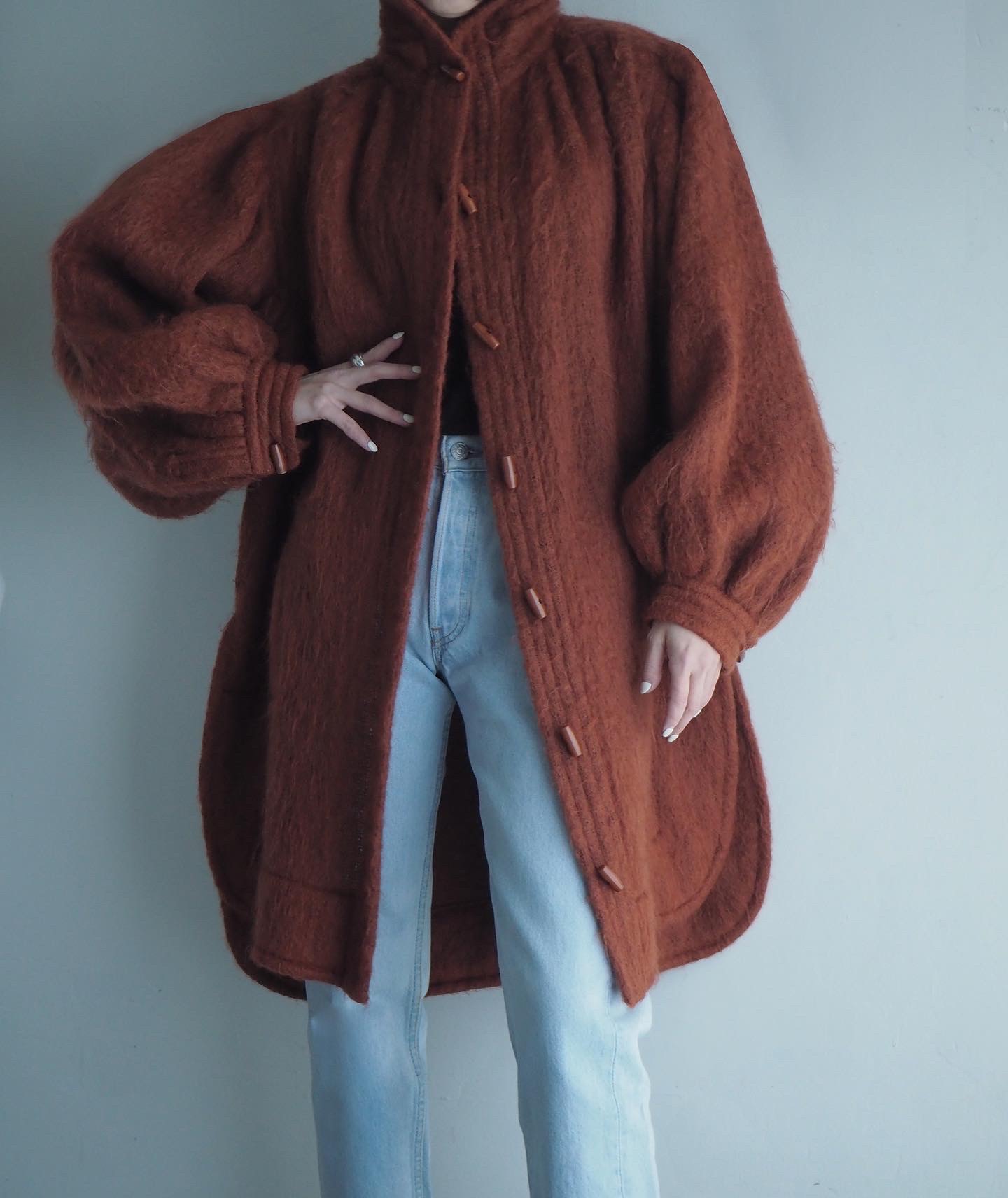 オレンジブラウンの温かみのある穏やかな色彩や控えめなシャギーテクスチャーに思わず引き込まれるロシアンコレクションのロングコートは、身体の動きに伴って贅沢なボリュームやニュアンス豊かな表情を見せるスリーブデザインが特徴。