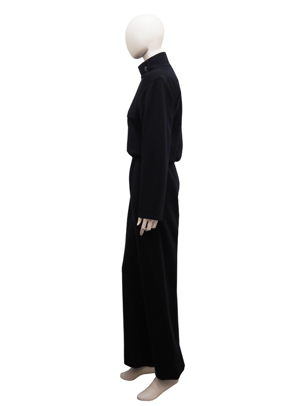 フロントジップ仕様のジャンプスーツは、華美な装飾を控えたデザインとスタンドネックのバランスに洗練された空気が宿る一着。