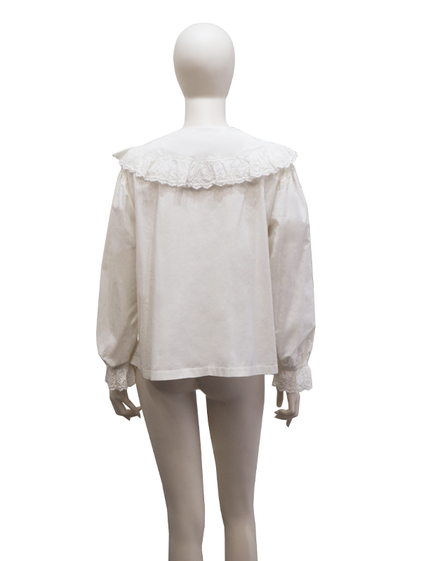 襟や前立て、袖先に施されたカットワークデザインが印象的なシャツは、フロントに細かなピンタックや繊細な刺繍が施され、クリーンな雰囲気の中にセンシュアルな空気感が漂う一着。