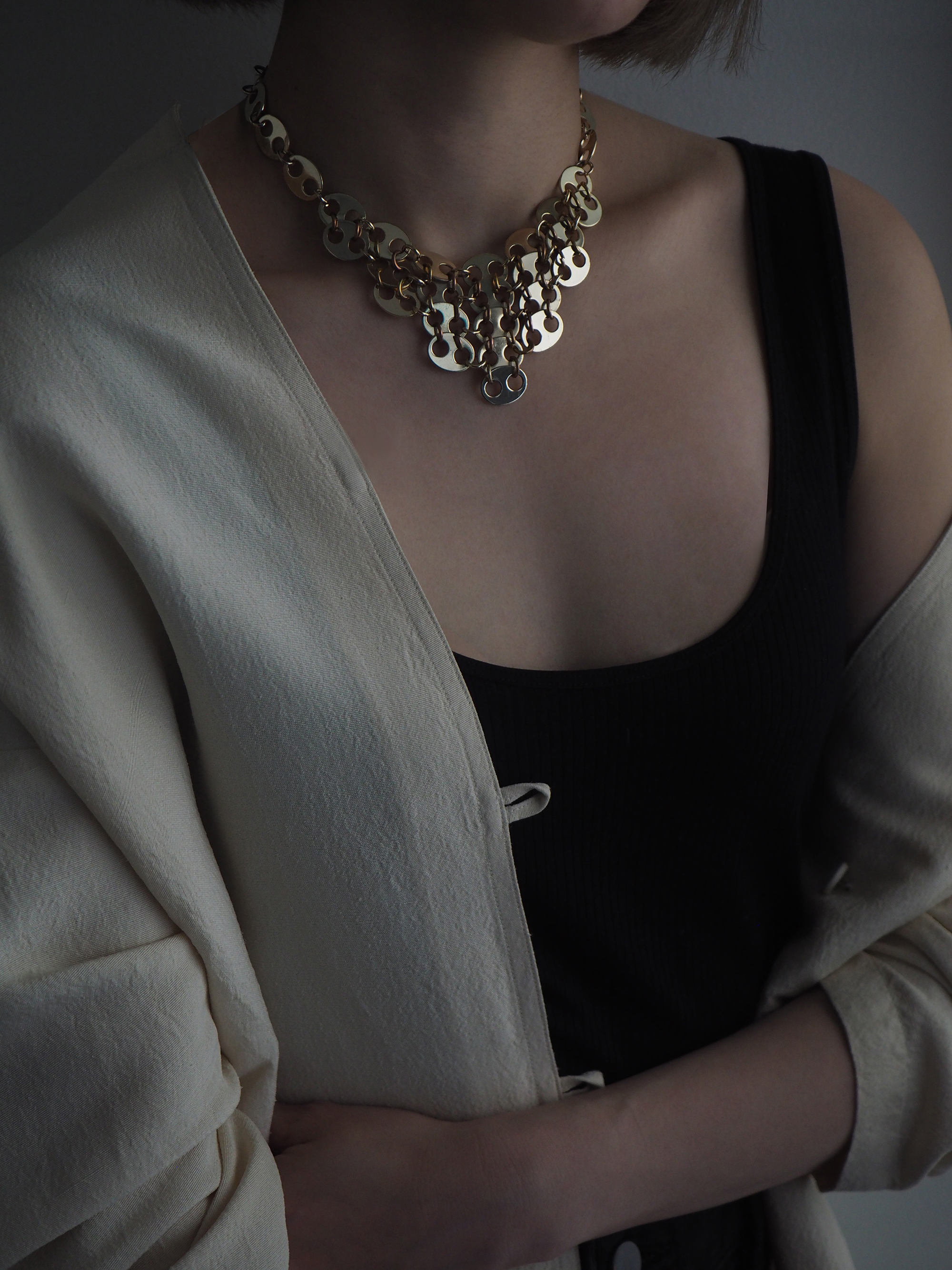 意表を突く素材使いが代名詞である、彼のアイコン的存在のメタルモチーフを繋ぎ合わせたネックレスは、構築的でありながらも、女性的な表情も持ち合わせた造形が特徴。