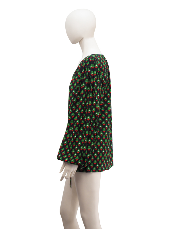 ハンドペイントによる柔らかなタッチのボタニカルモチーフが規則的に描かれたプルオーバーシャツは、身体の動きに伴って贅沢なボリュームを伴うバルーンスリーブや、薄手でシボ感のあるマテリアル特有の発色の温かさ、華奢なラインがコントラストに繋がったボウタイ、その全てのバランスにYves Saint Laurentの感性の高さが感じられ、前年に発表されたロシアンコレクションの流れを汲んだ貴重な一着。