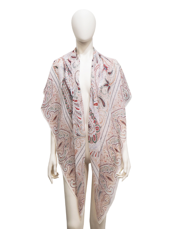 ホワイトベースに柔らかな色彩で描かれたオリエンタルなペイズリーパターンのスカーフは、シアーで滑らかな肌触りと130cm×130cmの大判サイズが魅力。