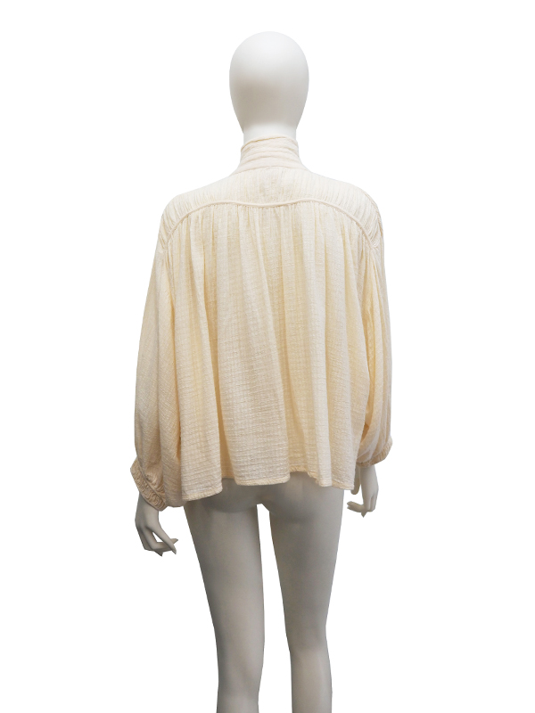 優しいペールイエローのプルオーバーブラウスは、デコルテからショルダーラインにかけて施された細やかなギャザーやドラマティックなシルエットを見せるスリーブのボリュームが特徴。