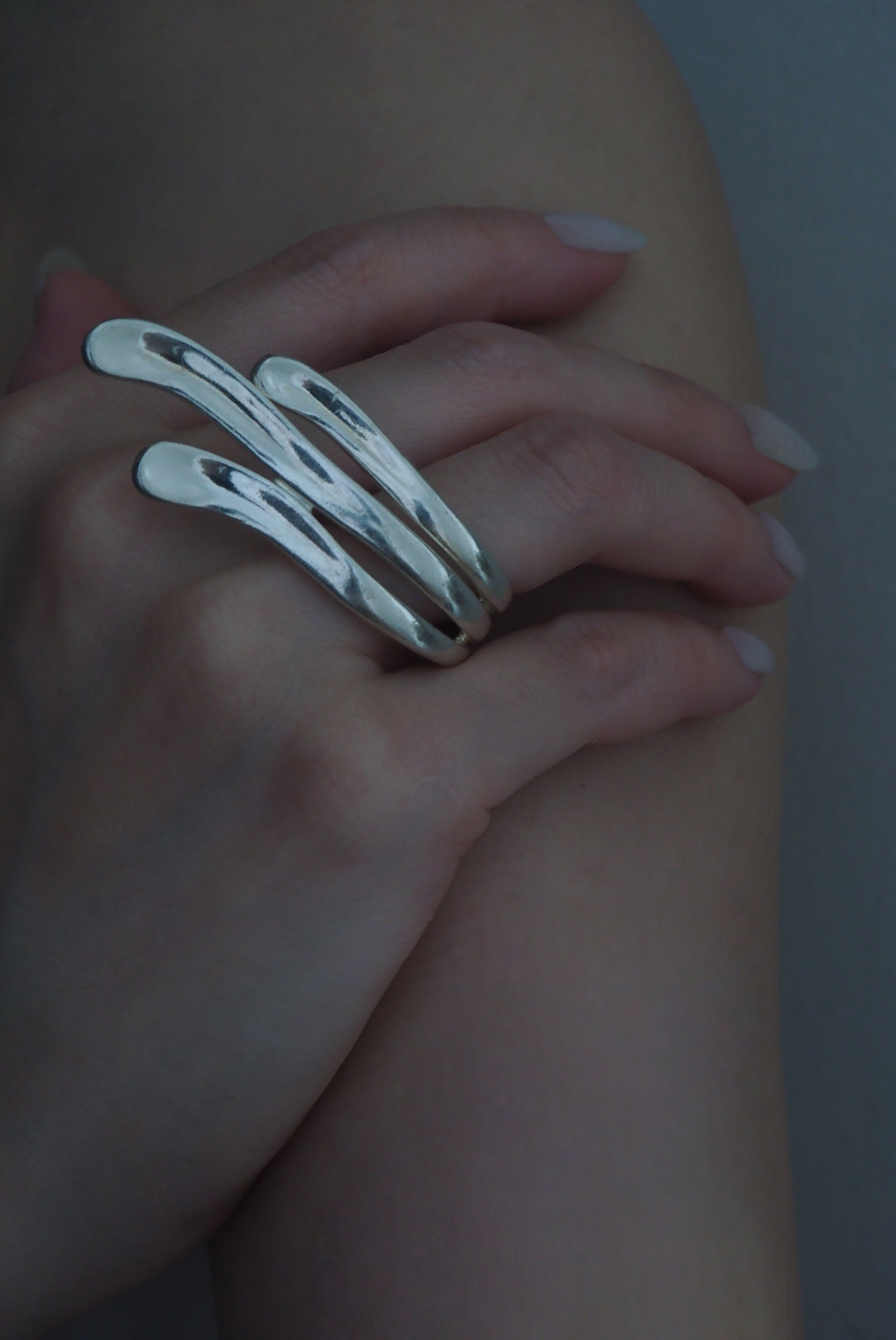 長さの異なる三本のモチーフの間からは素肌がのぞき、優しく手元を包み込む曲線を描くリングは、艶やかなテクスチャーと立体的に富んだコンテンポラリーなフォルムが特徴。